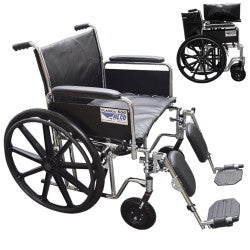 The Alco 500 Bariatric Heavy Duty Wheelchair offers customizability with your choice of Detachable Desk or Full length arms, as well as Swing Away or Elevating Leg Rests. The Alco 500 wheelchair comes in seat widths of 20", 22" and 24" by 18" depth. A reinforced carbon steel frame with Dual Cross Bar provides this heavy duty wheelchair a weight capacity of a 500 lbs. The carbon steel frame has an attractive, chip proof, maintainable, triple coated, chrome finish and double embossed, vinyl upholstery, making this bariatric wheelchair durable, lightweight, attractive and easy to clean. The standard, dual axle, conveniently provides an easy transition of seat to hemi-level. Comes standard with detachable desk arms, elevating footrests, 8 front caster wheels, urethane tires, aluminum footplates, chrome hand rims, and push to lock wheel locks, ensuring user safety. 3 year warranty. Available in models: 170031BK-DF, 70031BK-DL, 70031BK-FF, 70031BK-FL, 70032BK-DF, 70032BK-DL, 70032BK-FF, 70032BK-FL, 70033BK-DF, 70033BK-DL, 70033BK-FF, 70033BK-FL