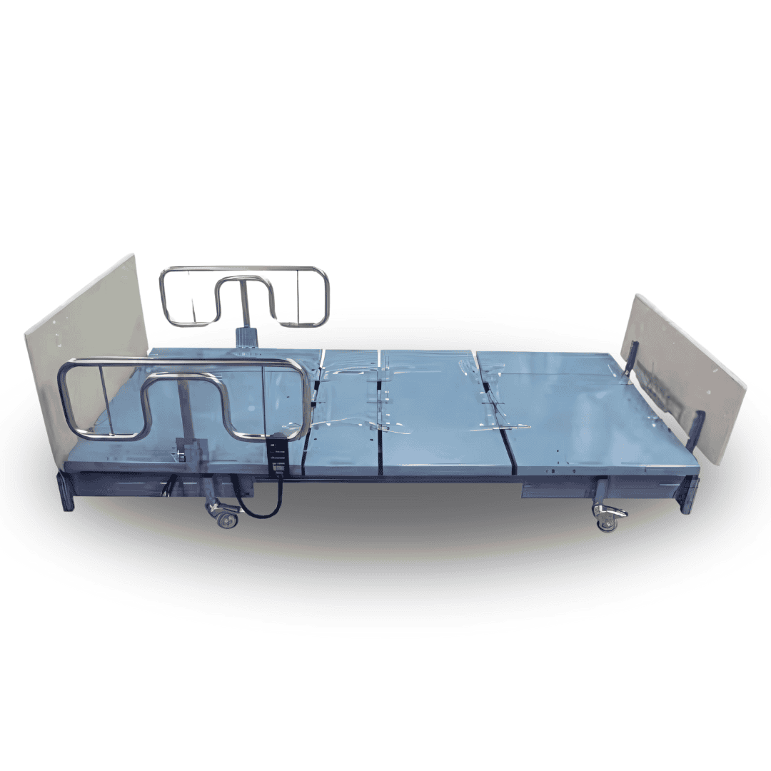 The Big Boyz Bariatric Low Bed 800 with Mattress offers a lower height range of 17.25" to a raised height of 31" with included 6"H mattress. This Big Boyz Low Bed is specifically designed for Long Term Care, Rehabs and Nursing Home use, offering two widths in one easy-to-operate bed unit. The slide feature can transform the width of the bed from 48 inches to 38 inches. This dual function beds can be used as a gurney for easy transfer through doorways and emergency evacuation.