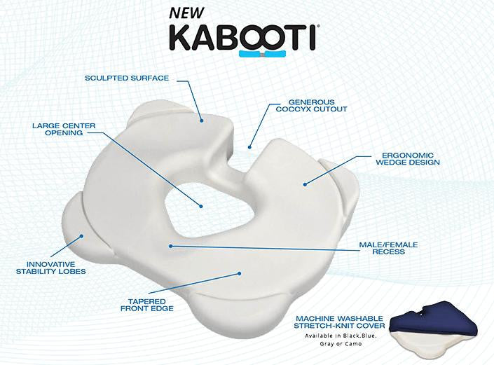 Comfort sore and sensitive areas with this innovative new seat cushion! The KABOOTI high density foam seat cushion provides a complete solution to seating by combining the best features and benefits of a ring shaped donut cushion, coccyx cushion and a traditional seating wedge. Our seat cushion has a completely re-invented ergonomic design you won't find anywhere else. If you need a donut cushion or a coccyx cushion for medical reasons or improved support, or a superior seat cushion which can provide all-day comfort, this is a great choice.