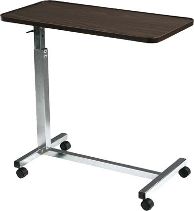 The Drive Medical Tilt Top Overbed Table tilts 33 degrees in any direction and can be raised and lowered between 29.5" and 46". A handle locks the table's position in place providing a safe, secure surface for a variety of activities. The Chrome-plated steel "H" base provides added stability and swivel casters allow for maneuverability.