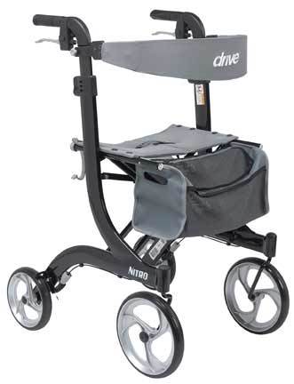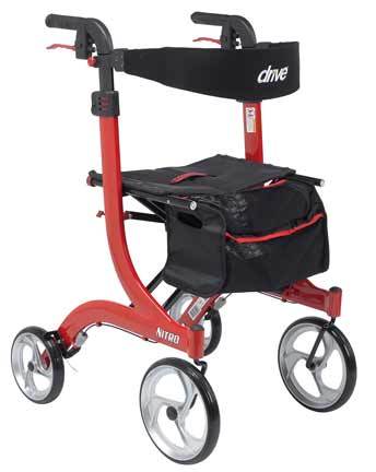 The Drive Medical Nitro Rollator Tall model RTL10266-T is made specifically for users 6' 0" and taller. This innovative new rollator is sporty and stylish. In addition to its Euro-style good looks, the Nitro Rollator Tall model is also lightweight, sturdy, and ultra easy and convenient to use and store. The handle height is easily adjustable to customize a perfect fit. The padded back support is comfortable and easily adjusts with a tool-free thumb screw. Large 10" front casters allow for optimal steering and smooth rolling comfort. The Nitro Rollator RTL10266-T is available in Red or Black.
