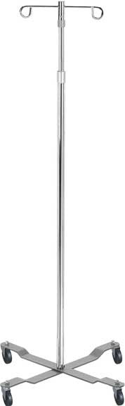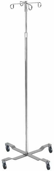 Removable hooks on this economy 2 or 4 hook IV pole (in chrome or silver vein) by Drive Medical speak to its versatility. Adjustable height from 40" to 82" to meed almost any height need. Chrome-plated steel with weighted base provides strength and durability, while, most importantly, reducing the risk of tipping. A locking collar allows for simple height adjustment to the stem and four rubber wheels ensure smooth transportation and maneuverability.