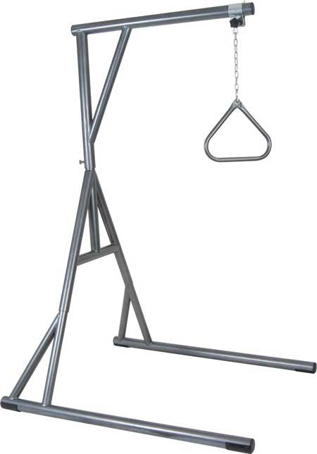 This Free-Standing Trapeze 13039SV from Drive Medical is designed to assist patients weighing up to 600 lbs. with changing positions while in bed, as well as assist with transfers from bed to chairs. The trapeze chain is adjustable from edge off headboard to the end of the boom by sliding to desired position.