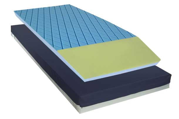 - Mattress includes a 6" to 5" heel slope and a "channel cut" center layer of foam under the foot section to target heel ulcer prevention