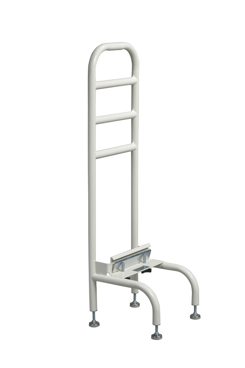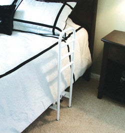 The Drive Medical Home Bed Side Helper Assist Rail has four legs and attaches to the frame of a standard bed. The 11" wide solid steel tubing frame allows either one or two-handed use.