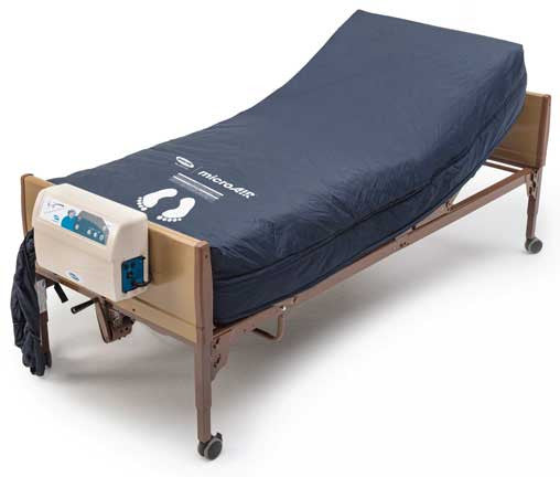 Invacare's microAIR Alternating Pressure Mattress System 36"W x 80"L features True Low Air Loss and Pulsation therapy. The MA800 system's True Low Air Loss feature helps manage skin moisture to avoid maceration and maintain a dryer environment for pressure ulcer healing in the treatment of Stage I to Stage IV pressure ulcers. True Low Air Loss therapeutic support wicks away moisture and maintains a temperate environment for the user. The MA800 line features Advanced 3-in-1 Alternating Function inflates and deflates cells in a 3:1 cycle to provide active pressure relief by supporting two-thirds of the user's body weight at any given time. The included 60-second Pulsation Therapy feature helps additionally adds gentle stimulation action to promote capillary blood flow to the skin. And the system's HeelSense Technology helps provide further therapy and comfort by decreasing pressure in the user's vulnerable heel area. *Bed shown in photo sold separately. Download the microAIR MA800 brochure here.