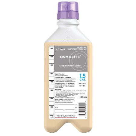 Osmolite 1.5 Cal is a source of complete, balanced nutrition and a high-protein, low-residue formula for tube-fed patients who may benefit from increased protein and calories. For supplemental or sole-source nutrition. May also be used for oral feeding of patients with limited volume tolerance. Available in Ready to Use 8 oz. Carton and 33.8 oz. Ready Hang Container.