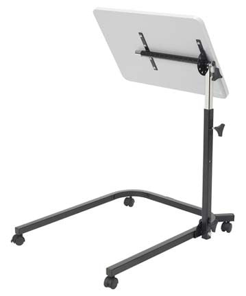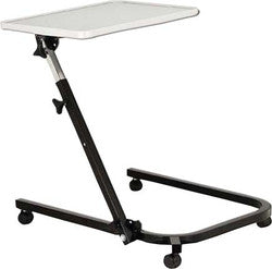 Drive Medical's Pivot and Tilt Adjustable Overbed Table Tray features a pivoting top and an angled base to fit under almost any bed and over most mattresses. The mast of the table pivots for custom needs, and can be locked in one of the three positions from flat on the floor to 90 degrees. It is ideal for activities such as eating, writing, reading and more.
