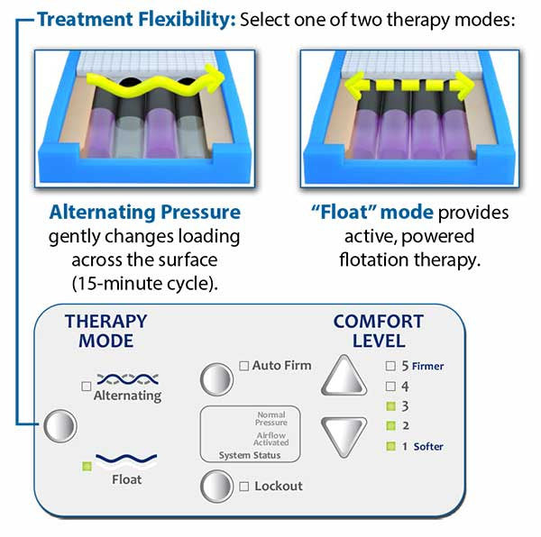 The PressureGaurd Easy Air Alternating Pressure Mattress is independently documented to outperform every leading low air loss system. This mattress is unique for its ability to control maceration by removing excess moisture using Span-America's exclusive "Air Diffusion Matrix." This ensures a constant flow of air beneath the patient to help treat and prevent stage 1-4 pressure injuries. The alternating pressure is preset with a 15 minute cycle, and gently redistributes pressure across the surface to equalize pressure on the users body. The Float Mode provides active floatation/pulsation therapy. This is a gentle pulse stimulation action to promote capillary blood flow to the skin. Featuring a Heel Slope design to further reduce heel pressure, along with head to foot air cylinders for better pressure reductions.