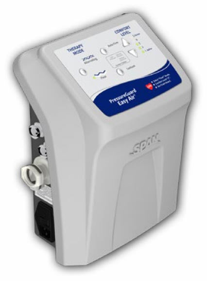 The pump has simple controls while still delivering maximum performance. Auto Firm is timed at 30 mins for added stability during transfers and nursing procedures. The PressureGuard mattress's "Safety Edge" is a two-part bolster system surrounding mattress air tubes on both sides, and at the foot of the mattress. When the user rolls towards or sits on the edge of the mattress the inner two parts bend in toward the center making the edge resist collapsing to make transfers safer. The mattress is simple to set up, quiet, and has an efficient control unit. Easy Air won't lose inflation in a power outage. The underlying air cylinders that supply the main support are not perforated. In the event of a power failure, the cylinders will remain inflated at a therapeutic level for literally days or weeks. Available in sizes: 35"W x 80"L (L8035); 35"W x 84"L (L8435-29); 39"W x 80"L (L8039-29); 42"W x 80"L (6470029); and 42"W, x 84"L (81300).