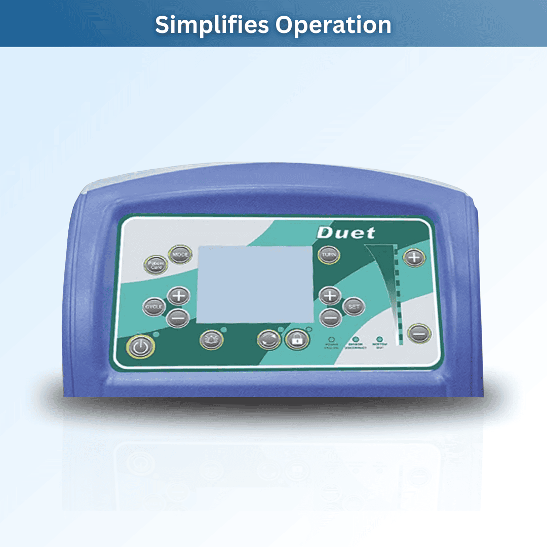 The Prius Duet Mattress System is a pressure prevention sleep surface for patients at risk of developing Pressure Ulcers, as well as for patients who have an existing Stage 1, 2, 3 and 4 pressure ulcers. In addition to 3-1 Alternating Pressure, the Prius Duet features True Low Air Loss to help keep the mattress surface cooler and free of humidity; Pulsation Mode 30-second pulsation therapy to help stimulate important capillary blood flow to the skin; and perform Lateral Rotation function up to 40-degrees rotation in 3 to 95 minute cycle times to meet the needs of users who require a turn schedule as part of their pressure prevention therapy. The Duet can auto detect the pressure of a patient’s bottom area automatically during Fowler Mode and adjust the pressure based on the results. This mattress also automatically sets optimal pressure based on patient’s weight, height and position—Alternating Pressure will continue to function, but Lateral Rotation will be disengaged until the head section is articulated lower.