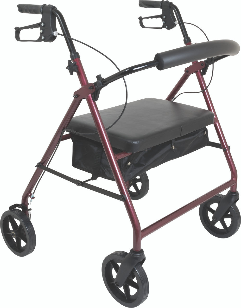 Strong yet lightweight, this bariatric rollator features an extra-strength, reinforced aluminum frame, generous dimensions, and a weight capacity of 400 pounds. The rollator weighs just over 18 pounds with large, 8" front and rear casters that provide smooth stability. The padded seat and removable padded backrest provide a comfortable resting area. The rollator also offers easy-to-operate ergonomic hand brakes, a water-resistant nylon pouch, and a built-in fold strap for easy storage and transport.